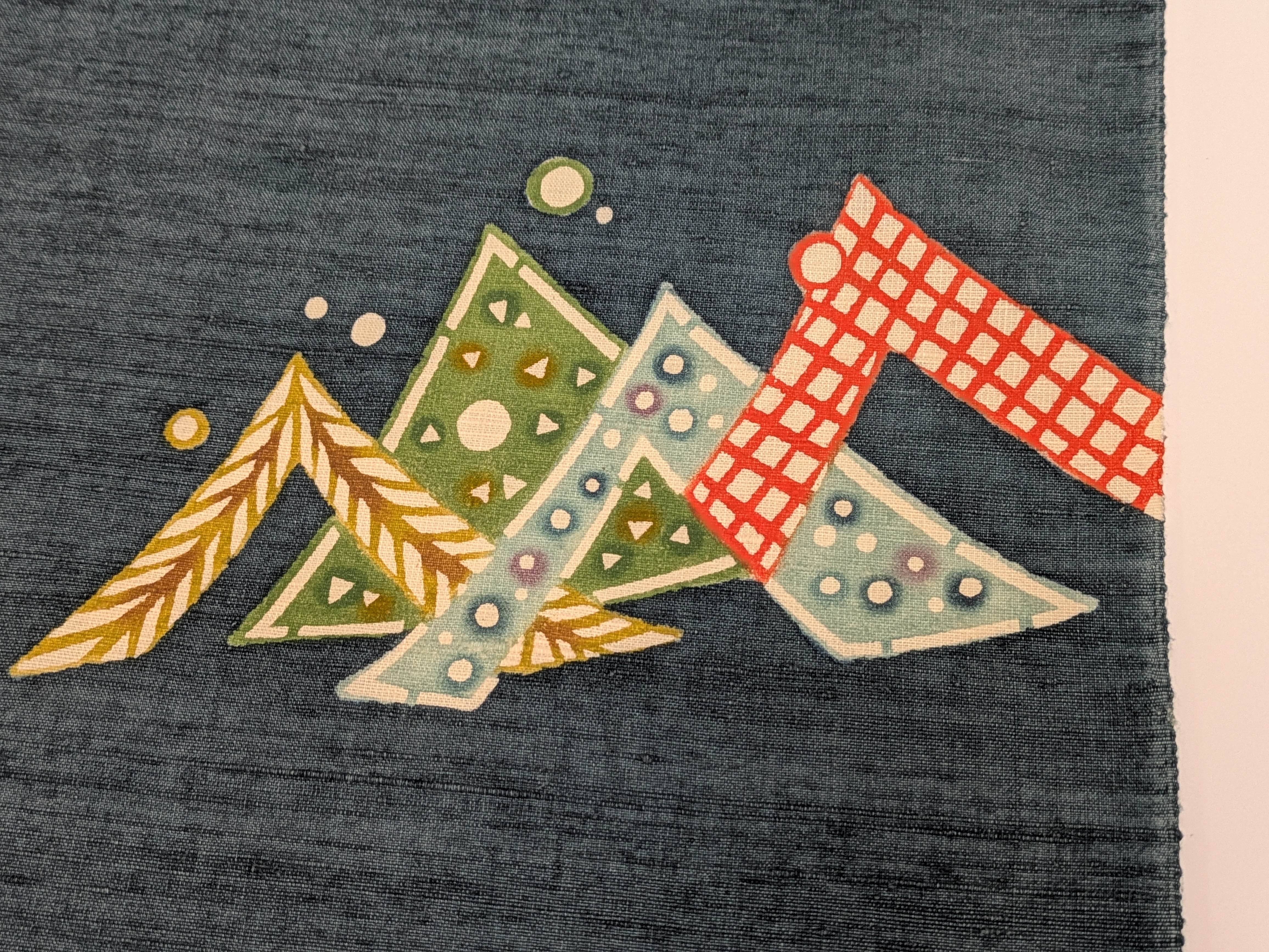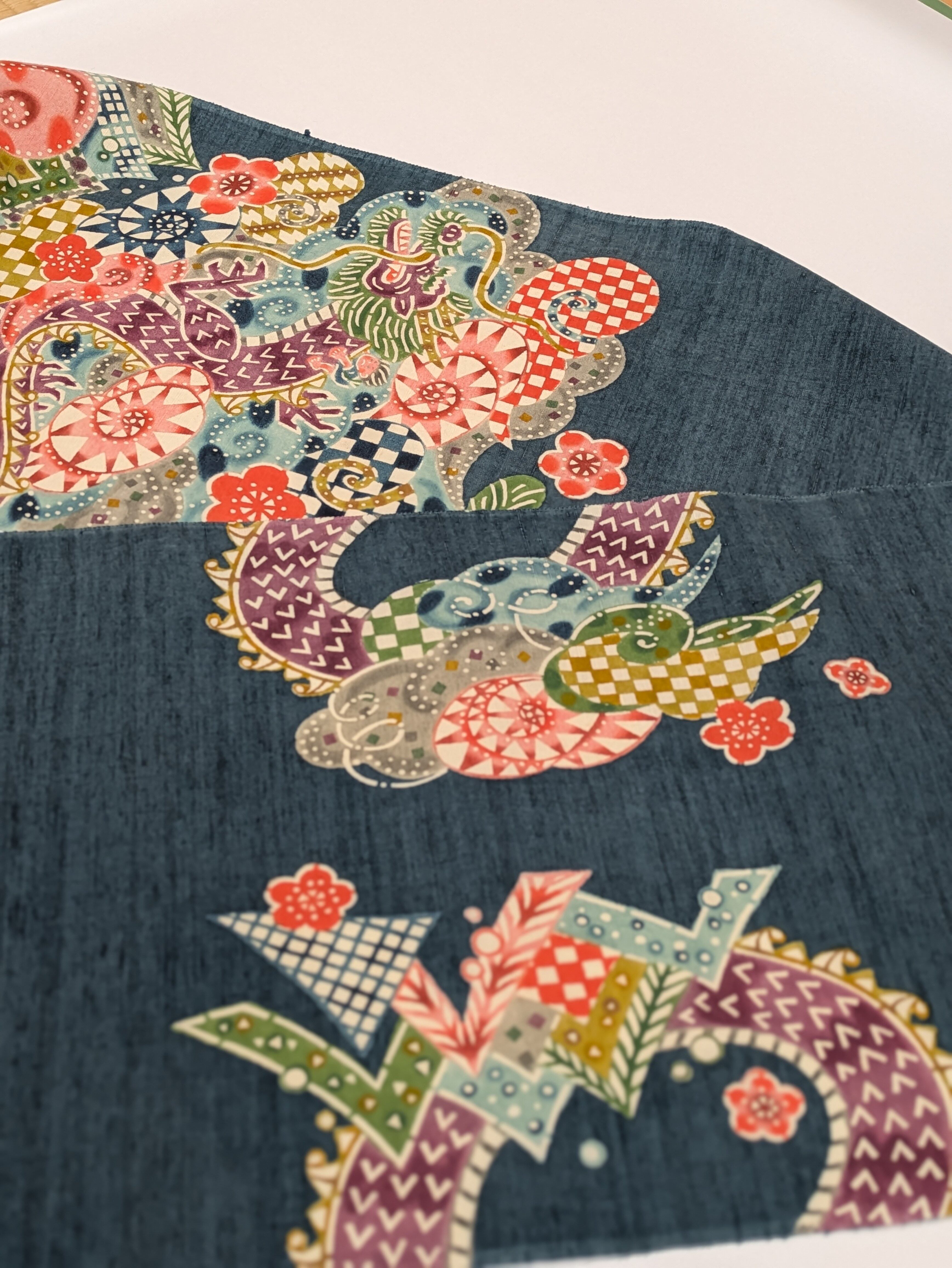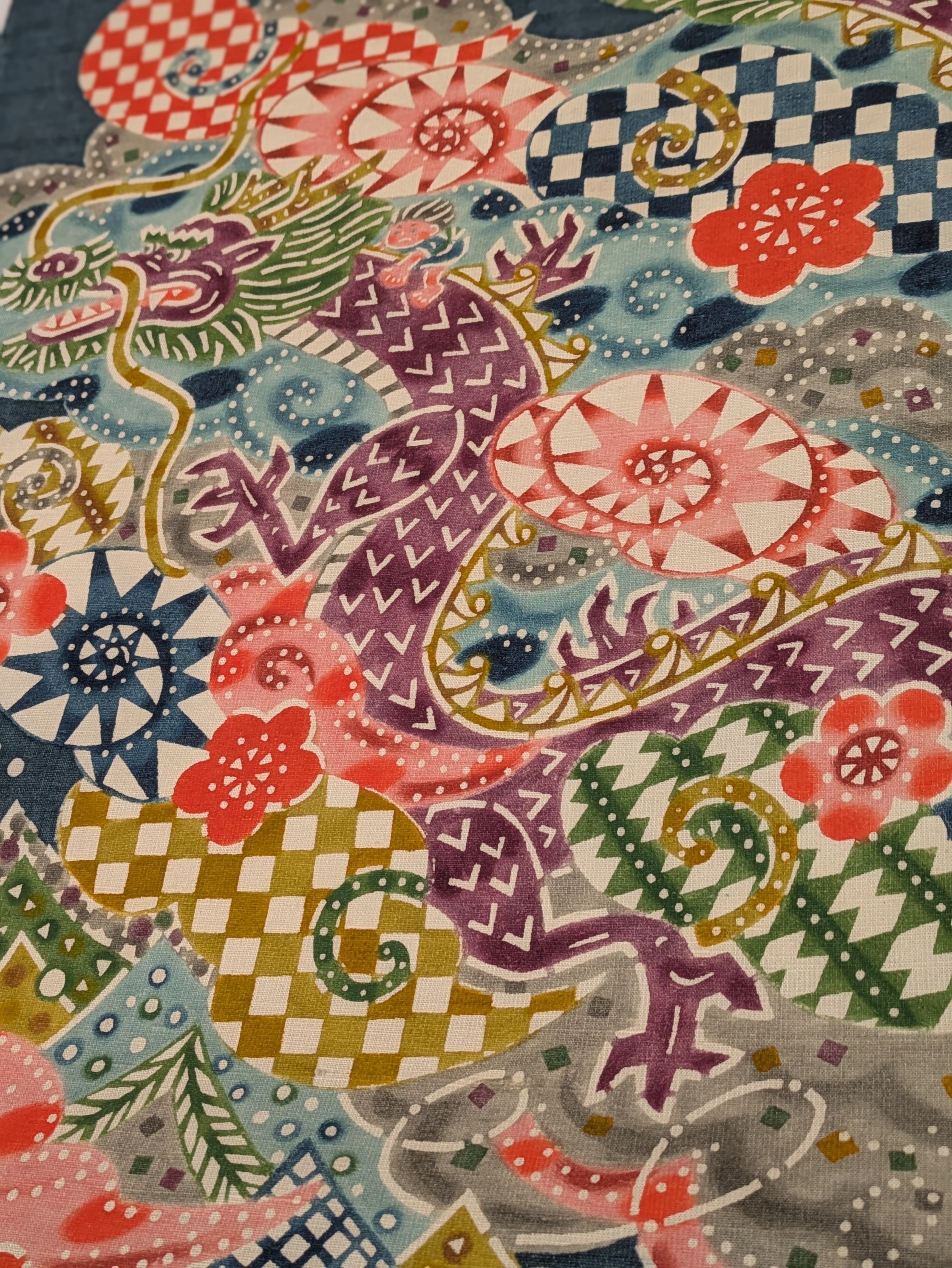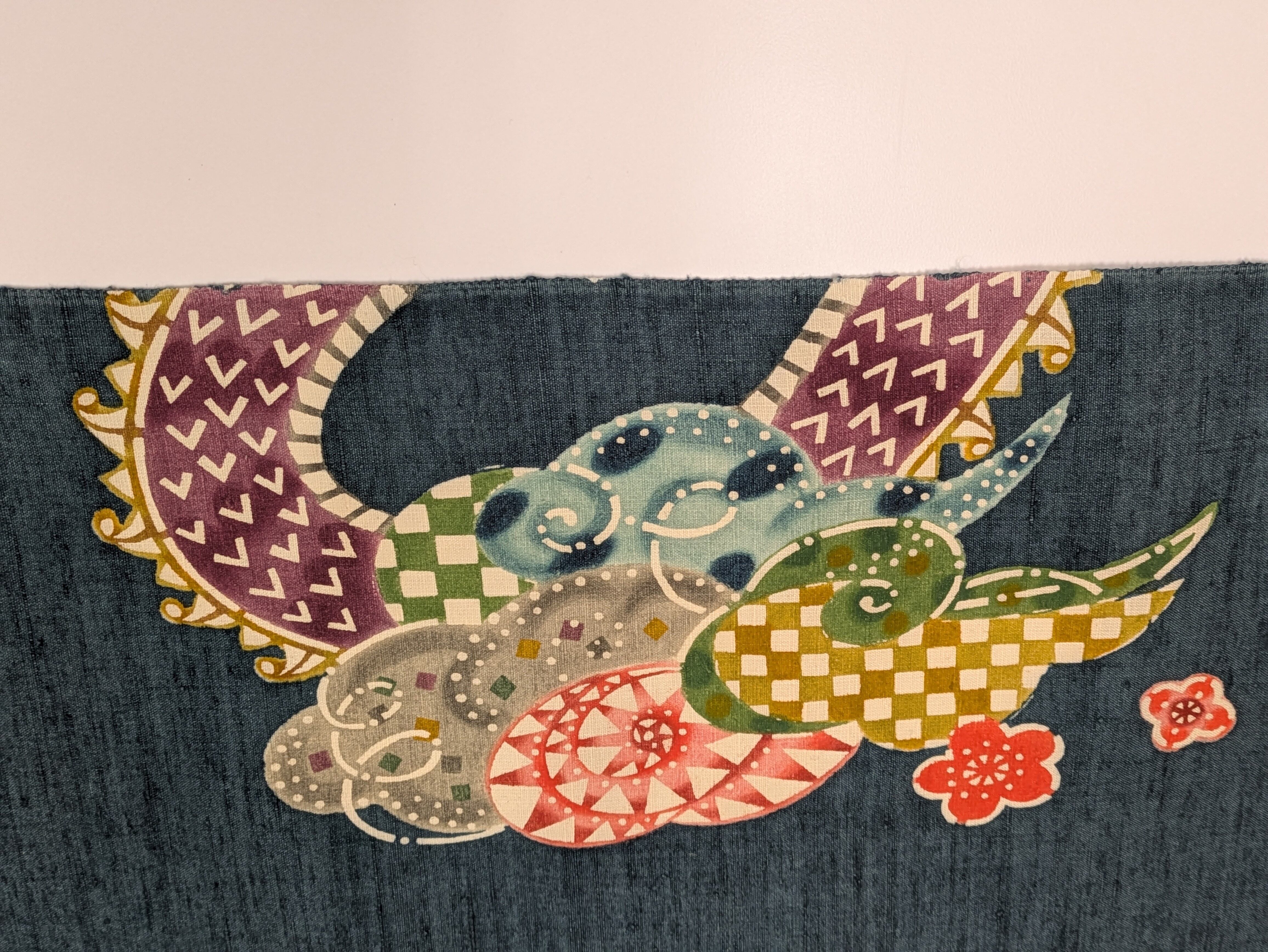 里山の美しさとお母さん龍と太郎の健気な姿を見事に型絵染めの手法で表現されております。