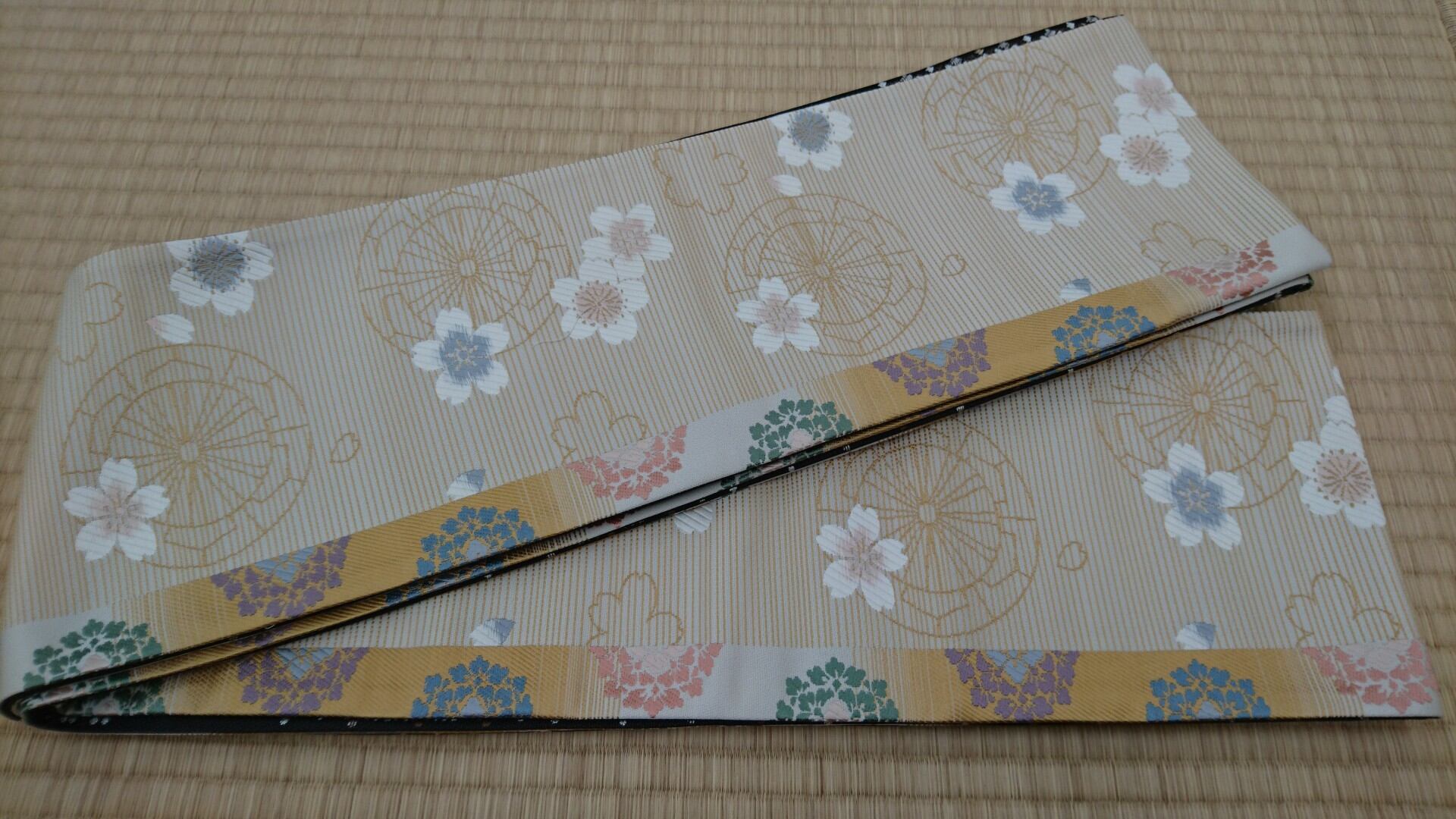 西陣正絹半巾帯(源氏物語御所車 /市松花菱 )【辻梅機業店】