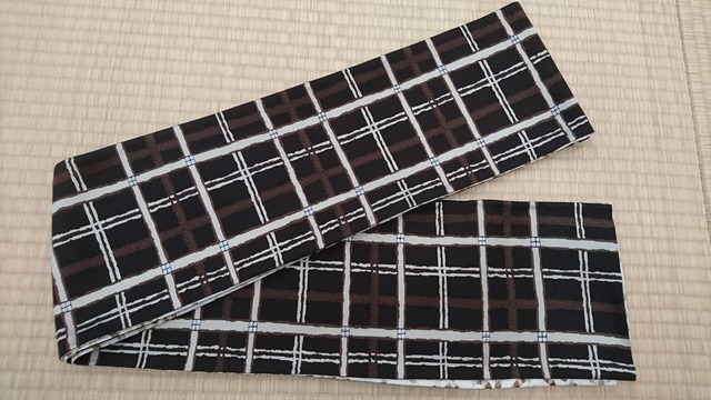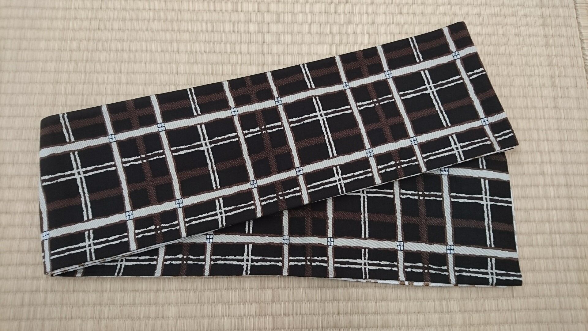 西陣正絹半巾帯(チョコ格子 / 雲柄)【辻梅機業店】
