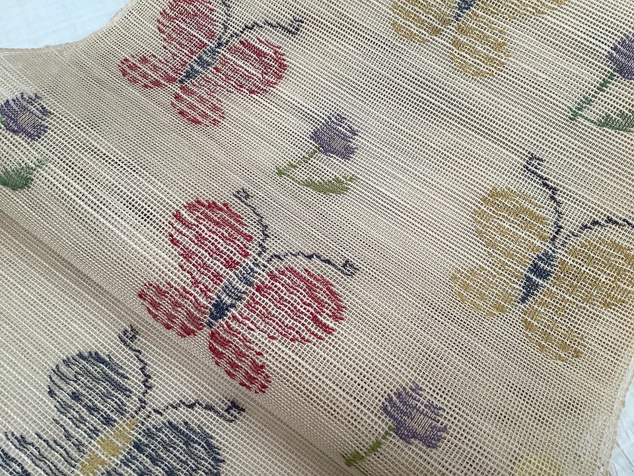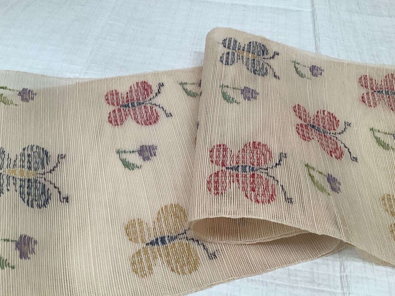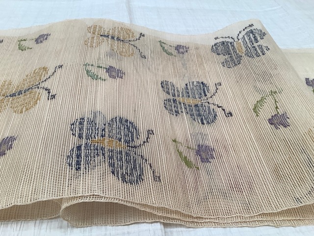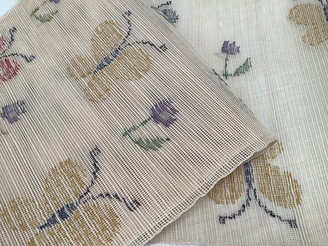 他の捨松さんの柄の作り方とは少し違います。夏帯らしくゆったり隙間を置いて織り上げられた粗紗地に、経糸(たていと)に絵柄の緯糸(よこいと)を潜らせて柄をデザインするのですが、このシリーズの帯の絵柄の緯糸は細いので隙間が空き、柄がのっぺりせず一段と見た目も涼しげですし、捨松さんらしい色使いが映えてとてもエレガントな存在感のある夏帯になっております。