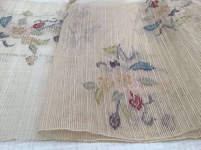 他の捨松さんの柄の作り方とは少し違います。夏帯らしくゆったり隙間を置いて織り上げられた粗紗地に、経糸(たていと)に絵柄の緯糸(よこいと)を潜らせて柄をデザインするのですが、このシリーズの帯の絵柄の緯糸は細いので隙間が空き、柄がのっぺりせず一段と見た目も涼しげですし、捨松さんらしい色使いが映えてとてもエレガントな存在感のある夏帯になっております。