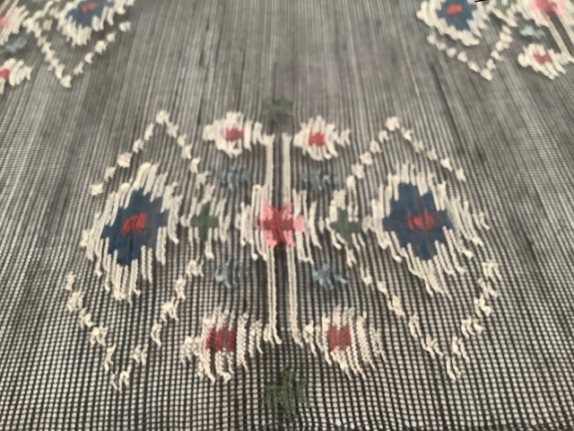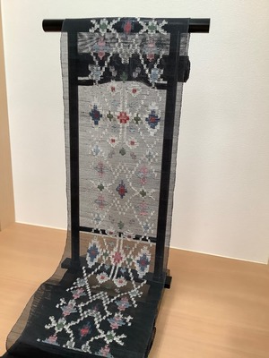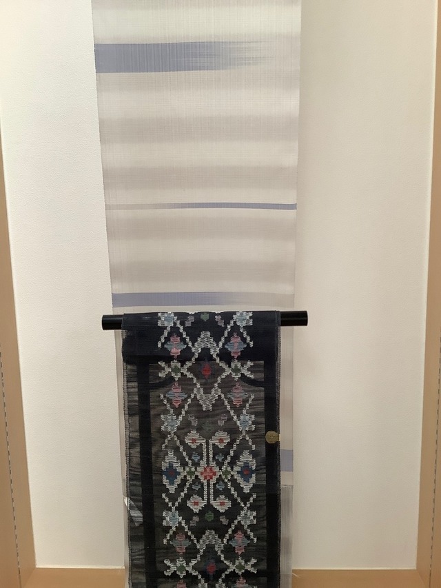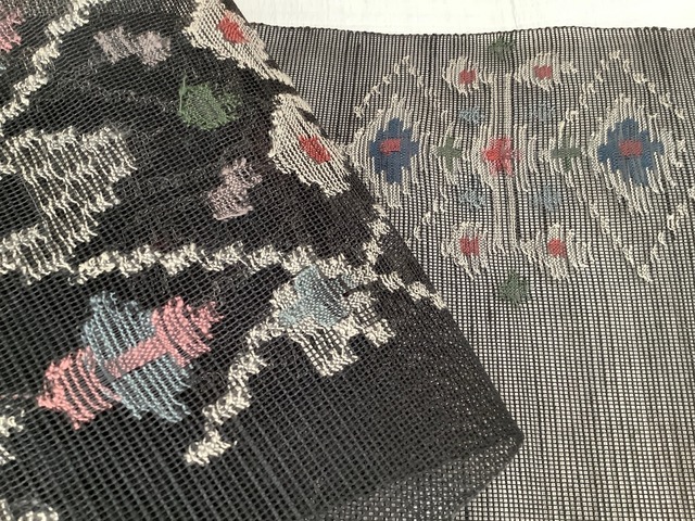 他の捨松さんの柄の作り方とは少し違います。夏帯らしくゆったり隙間を置いて織り上げられた粗紗地に、経糸(たていと)に絵柄の緯糸(よこいと)を潜らせて柄をデザインするのですが、このシリーズの帯の絵柄の緯糸は細いので隙間が空き、柄がのっぺりせず一段と見た目も涼しげですし、捨松さんらしい色使いが映えてとてもエレガントな存在感のある夏帯になっております。